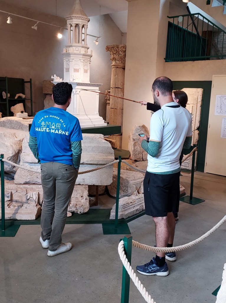 Le tour du monde de la Haute-Marne en vélo passait obligatoirement par Faverolles. Ici, Théo Caviezel et Johann Legrand visitent le musée du plus grand mausolée connu au Nord de la France, guidés par Juliette en service civique à l’association Segusia.