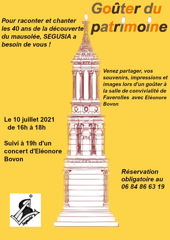 - Pour cette « gallopade », Segusia organise actuellement des apéros ou goûters du patrimoine où il s’agit de recueillir la mémoire des personnes en ce qui concerne le mausolée (ou la perception qu’elles en ont) pour en faire des chansons.